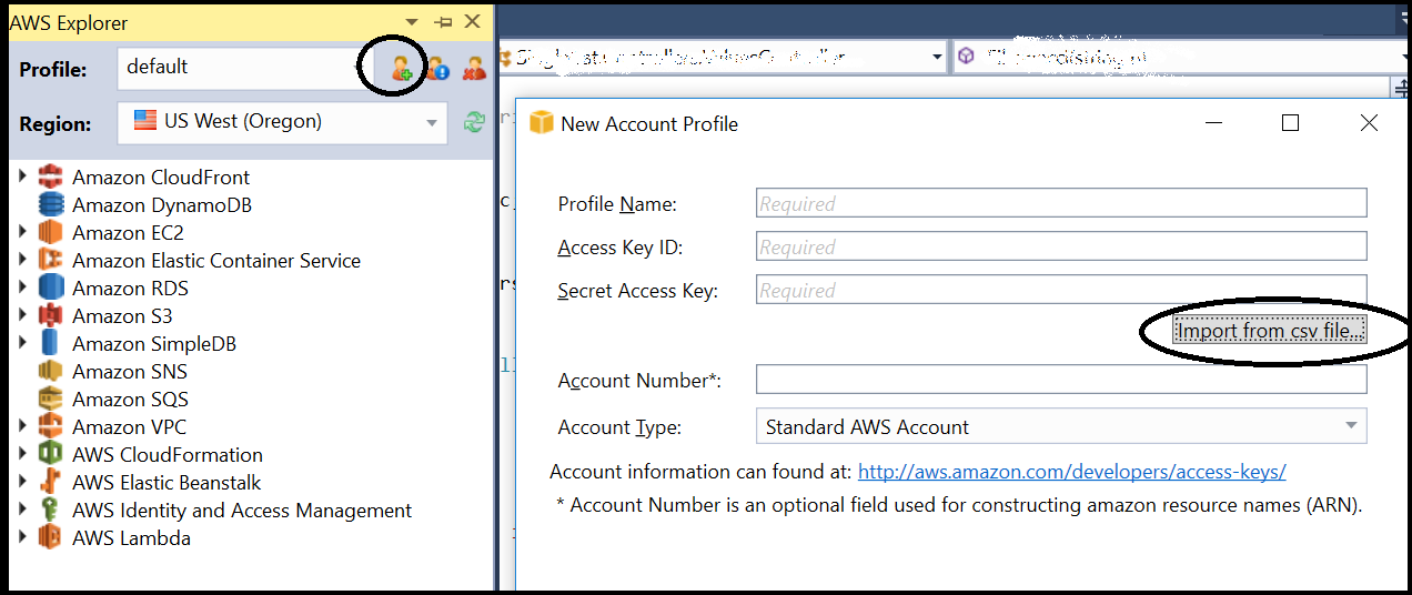 After restarting the Visual Studio (referred to as VS), a new explorer is born. Its genuine name is AWS Explorer. It is reachable via the View menu, or (Ctrl+K, A) if you like key shortcuts. To define a connection between the VS and your AWS account, you need to import the credentials of existing AWS users. This post will not dive into the IAM topic, but I will shortly mention that once you have an active AWS account, each of your profiles has unique keys. Those keys can be exported to a CSV file. Connecting the VS to AWS requires you to provide these credentials.