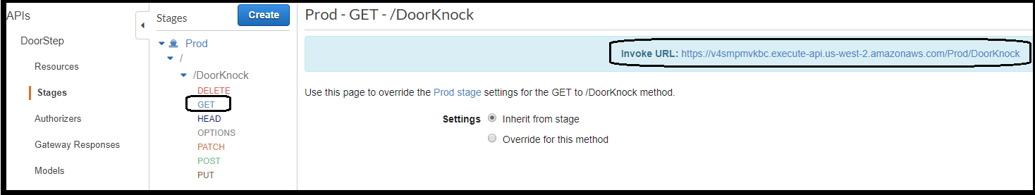 Navigate to the API Gateway stage that was configured before (we named it “Prod”). After selecting the GET command, the URL appears above: