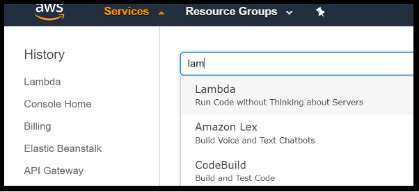 The next step is to create a serverless service. Under Services, search for Lambda services. Once the screen is opened, click on the “Create Function” button. For simplicity purposes, choose “Author from scratch” and set the function’s name. To be consistent with the example in this post, the chosen name is “DoorKnock”.
