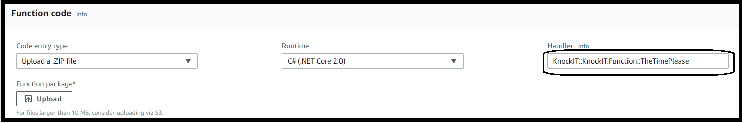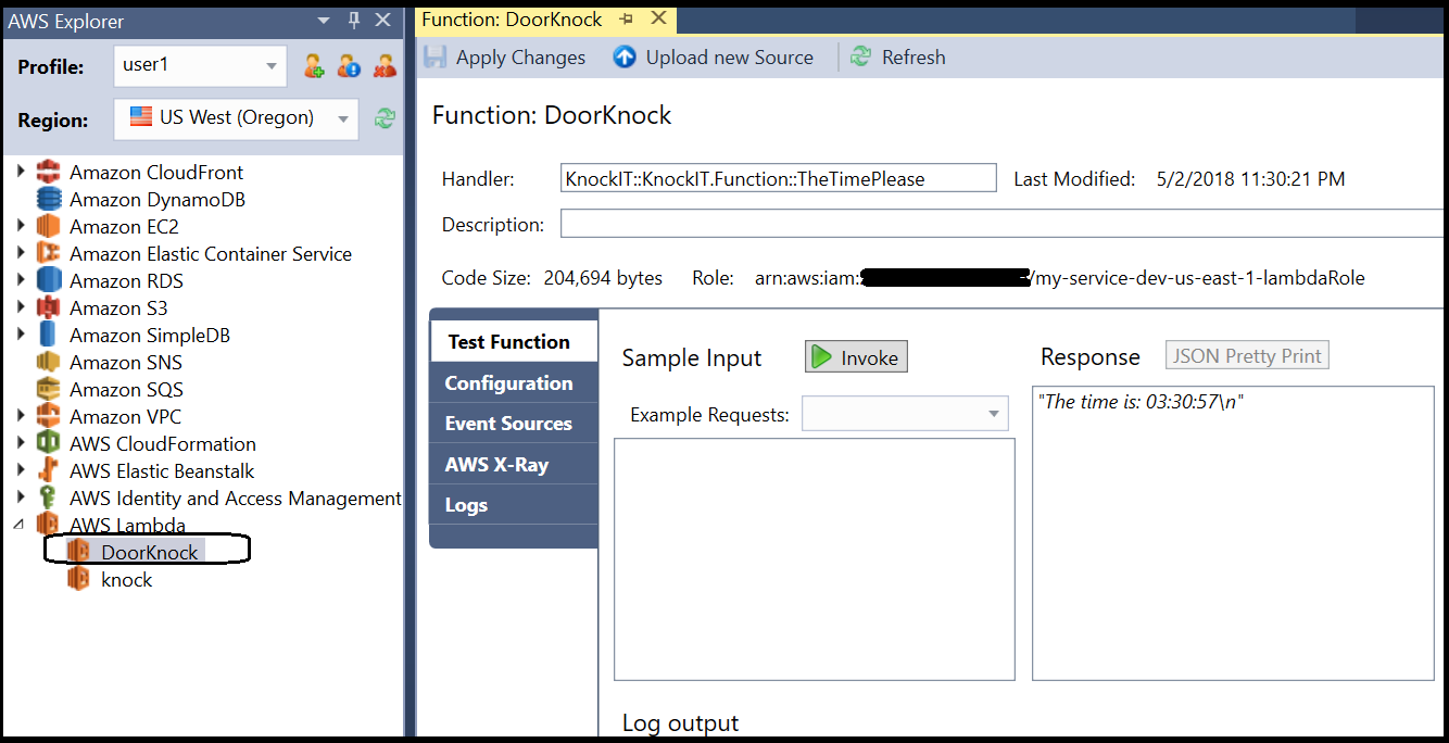 This panel can be accessed from VS AWS explorer as well. An interesting field is the function’s handler name, which is KnockIT::KnockIT.Function::TheTimePlease. This name is followed by the convention of assembly::namespace.class-name::method-name.