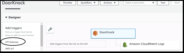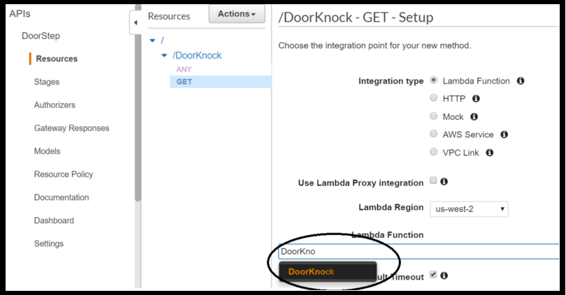 The next step is to create a GET request and connect it to our Lambda function. After selecting the newly created API, in the Resources menu, click on the Actions →Create Method item. Let’s select GET and relate it to our “DoorKnock” Lambda function. By doing that, the GET request of this API Gateway invokes our “DoorKnock” function.