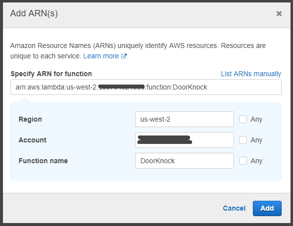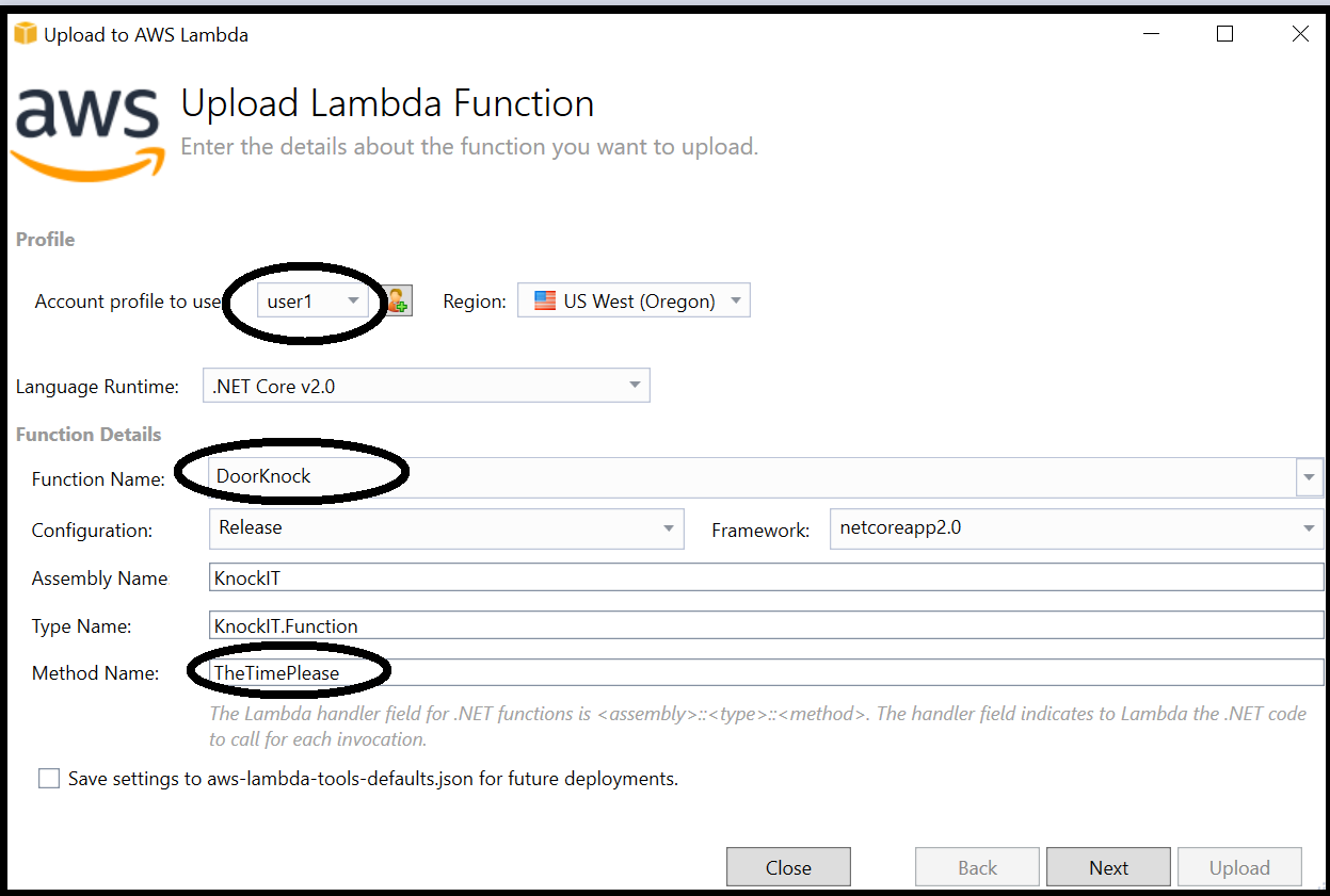Select the account profile to execute the upload process. This account should have proper permission set for executing the upload (don’t worry, we will address it later if this is not the case). The next vital fields are the function’s name (in our example it’s “DoorKnock”) and the method to be executed, and then click Next. If there are no problems and the connection to AWS has worked properly, the next screen should present the function’s execution role name and other execution parameters. However, there may be problems connecting to AWS, for instance, the chosen account did not have the right permissions to access Lambda resources, or there was a problem with the function’s assigned role. In these cases, AWS will prompt you about the problem. To rectify it, I suggest you seek a solution based on the error message. For more details about Lambda permissions model, click here. Anyway, these are not common errors.