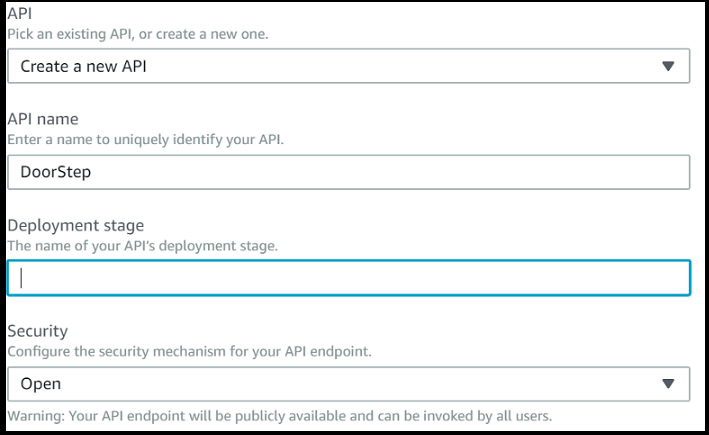 The whole concept of a serverless function is executed on demand. Therefore, the trigger for activating a serverless function is an external source. AWS provides a list of triggers. For demonstration purposes, I chose the simplest, which is API Gateway.After selecting the API Gateway option, its configuration appears below. In the configuration screen, choose “Create a new API” and set its name. The name of my function is “DoorKnock”, so staying with the same lexicon, I chose the gateway’s name to be “DoorStep”.