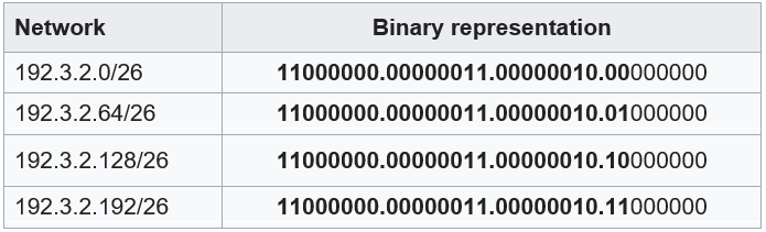 Subnet masks can be represented in 4 bytes structure or in CIDR format with /n after the IP address (CIDR stands for Classless Inter-Domain Routing). The CIDR block(/n after the IP address) is a value representing the total number of network ID bits. For example, reserving the first 26 bits for the network address creates 4 optional subnets: