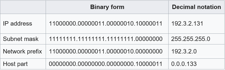 The table below demonstrates an IP address (192.3.2.131) with the subnet mask 255.255.255.0: