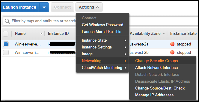 The screenshot below explains how to attach/detach a security group to/from an EC2 instance: