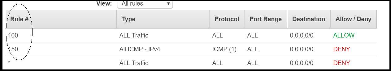 - The order of the NACL rules is very important. To facilitate this configuration, each rule has an order property (“rule #”). The asterisk rule (“*”) means it catches all the rules that were not caught before by higher-ranked rules.