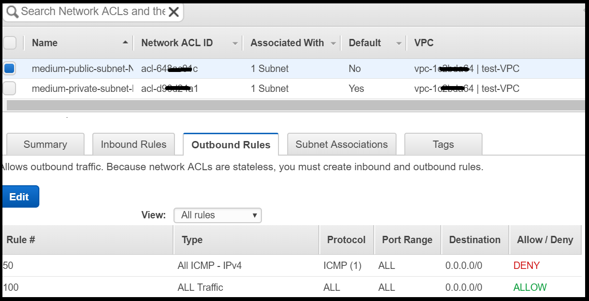 - The default VPC’s NACL has “allow all” rule, whereas any new additional NACL will have a “deny all” rule. Therefore, after associating a subnet to a newly created NACL, don’t forget to change this default rule.