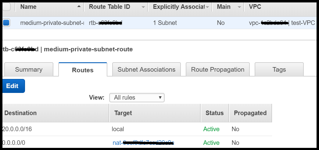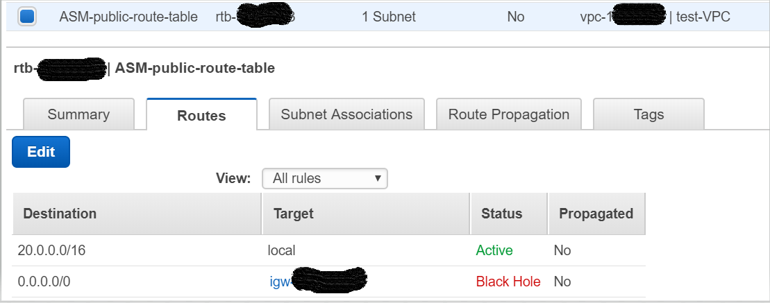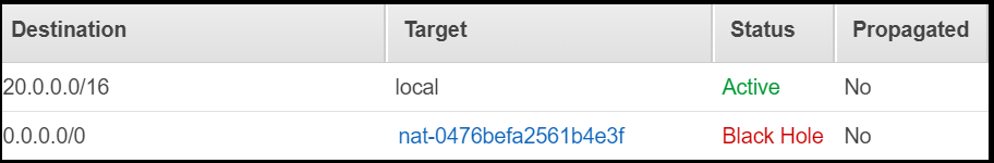 One last note, if you delete a NAT gateway but keep a routing rule in one of the route tables, the route status becomes “Black Hole”, as can be shown below: