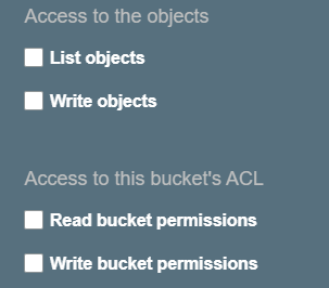 The permissions of the ACL are inclusive by definition (Allow only, without the option to Deny/Block operations). These permissions mandate the following actions: List objects, Write objects, Read bucker permissions, and Write bucket permissions.