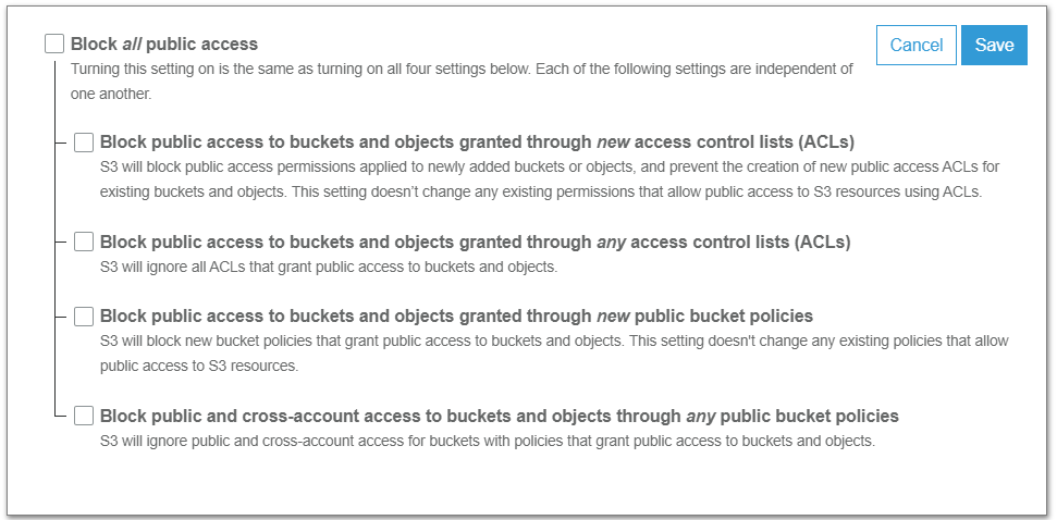 - Remove the public access that was granted to objects through any access control list (ACLs). This setting overrules all ACLs that grant public access to objects; once this definition is removed, the public access ACLs will become valid again (no need to reconfigure).