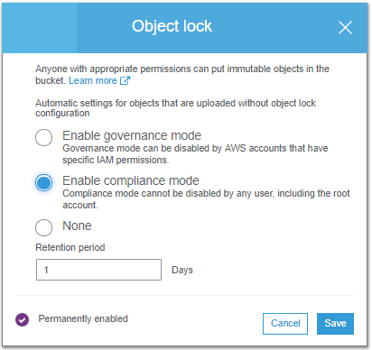 This feature should be used only if you need to prevent objects from being deleted, so mostly it is required to ensure data integrity and regulatory compliance. The lock period can be defined in a later stage after the bucket has been created.