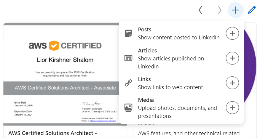 Share articles, posts, and certificates that represent your professional facade. The section is located at the top of the profile, so it catches the audience’s attention.