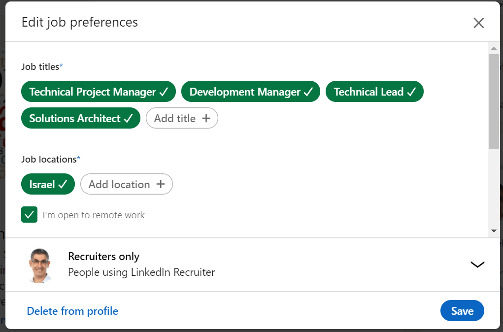 This line is very important. It is the first interaction with your profile. It should include a job description and other keywords that represent your skills. I don’t recommend “looking for my new challenge” since it contributes nothing about your expertise, past experience, and successes. - Signal to recruiters you’re open for new opportunities: